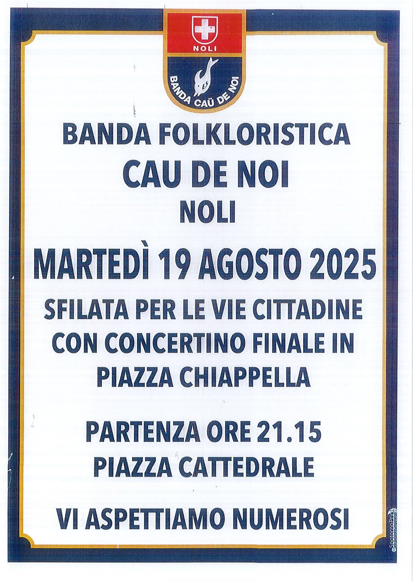 Martedì 19 agosto  sfilata per le vie cittadine della “Banda Folkloristica Cau dei Noi “con concertino finale in Piazza Chiappella.