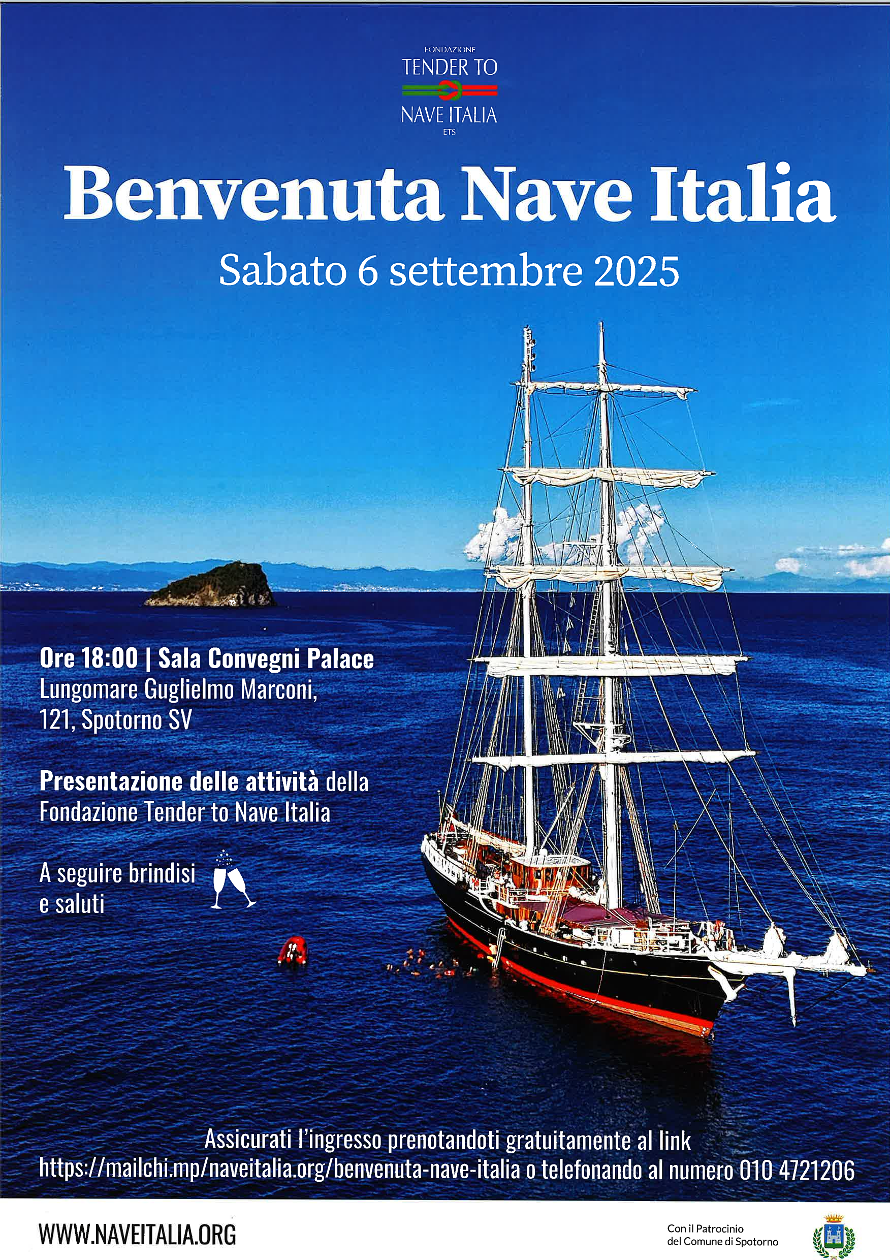 La Fondazione Tender to Nave Italia con il Patrocinio del Comune di Spotorno, presenta sabato 6 Settembre alle ore 18.00 presso la Sala Convegni Palace (Via Aurelia 121), tutte le attività della Fondazione Tender to Nave Italia con a seguire, brindisi e saluti agli intervenuti.