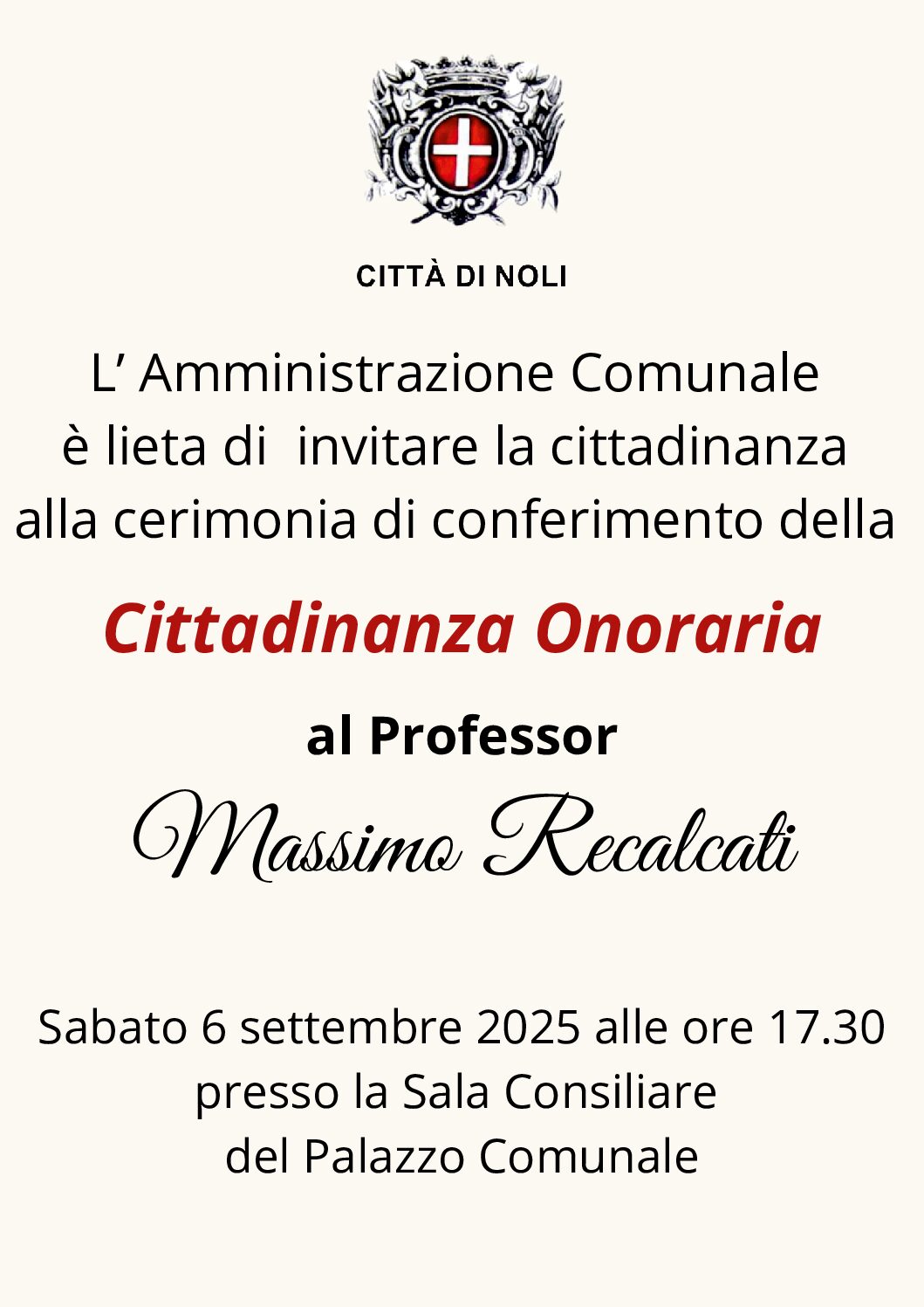 Sabato 6 settembre ore 17.30 presso la Sala Consiliare del Palazzo Comunale di Noli, conferimento della Cittadinanza Onoraria al Professor Massimo Recalcati