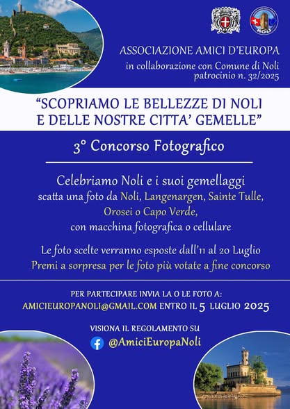 Concorso fotografico per celebrare l’amicizia che lega la Città di Noli alle Città Gemelle di Langenargen, Saint Tulle, Orosei e Capo Verde. Per partecipare inviare le fotografie a amicieuropanoli@gmail.com entro il 5/7/2025. Le fotografie più belle verranno esposte alla Mostra che si terrà dall’11 al 20 luglio all’interno della Chiesa di San Francesco (orario dalle 18.00 alle 22.00).