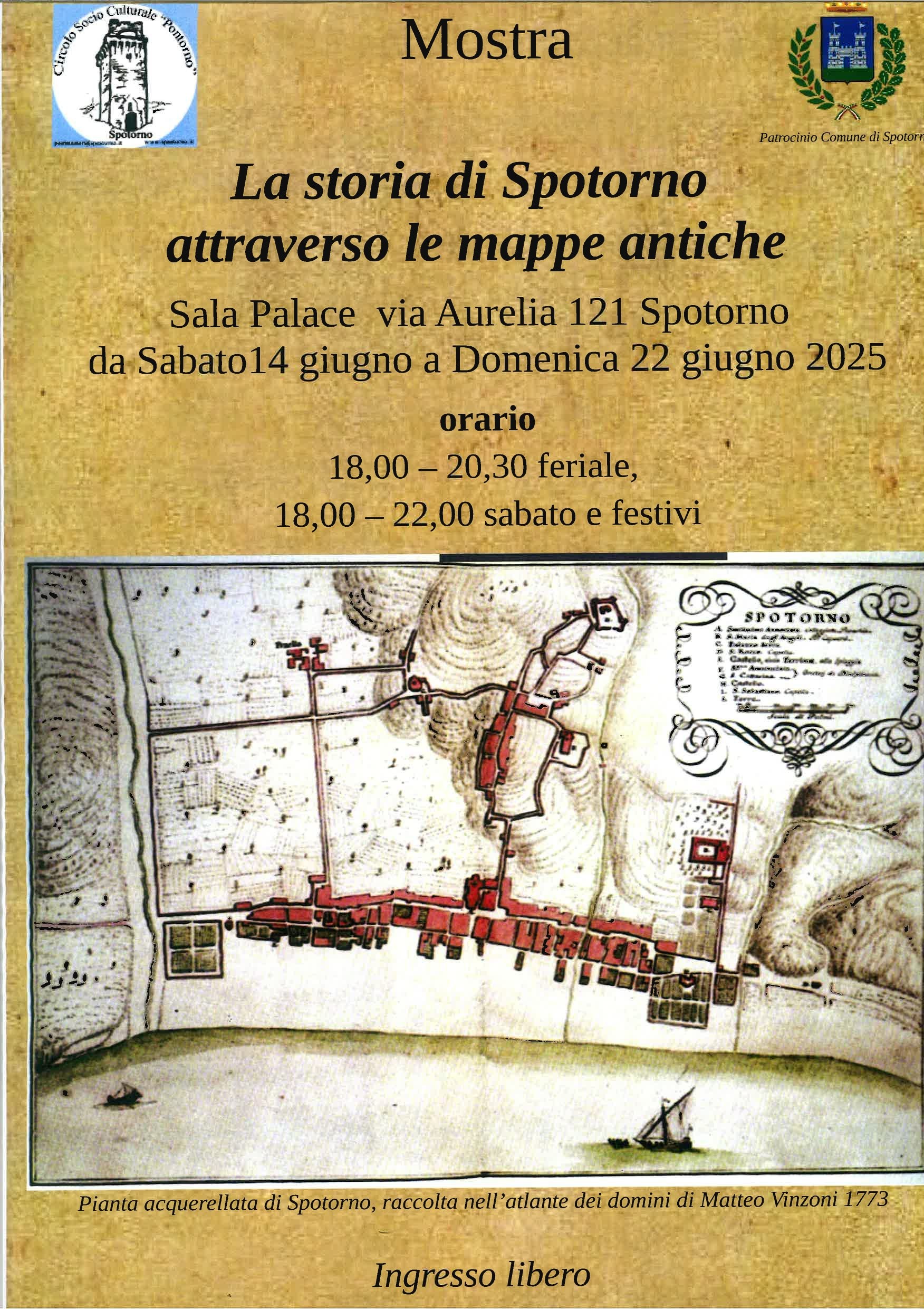 Il Circolo Socio Culturale Pontorno propongono la mostra dal titolo ‘La storia di Spotorno attraverso le mappe antiche’ tutti i giorni dal 14 Giugno al 22 Giugno, presso la Sala Congressi Palace, Via Aurelia 121.