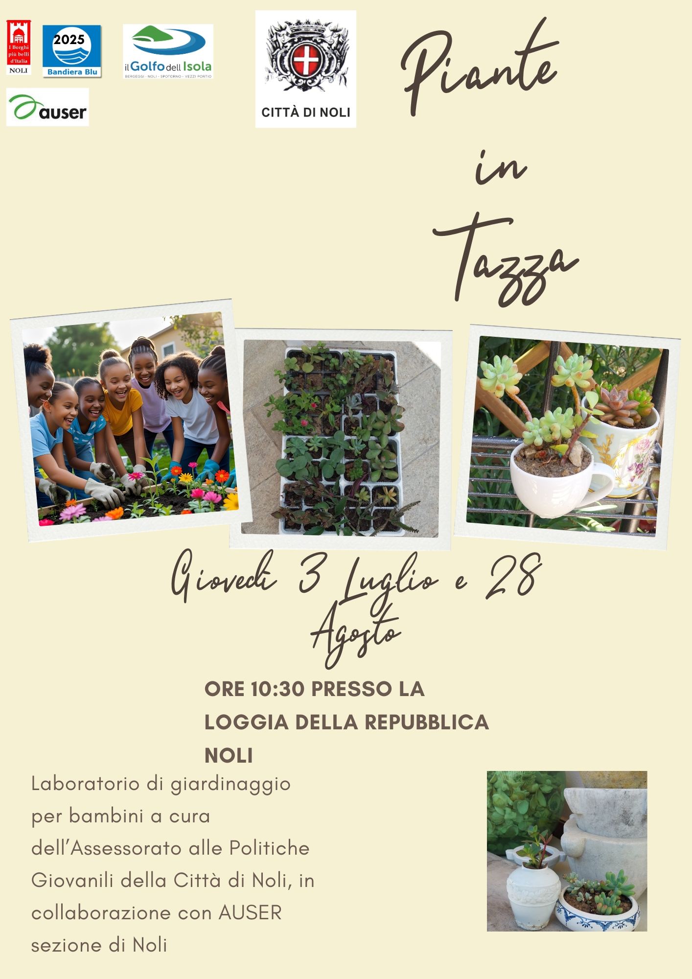 Giovedì 3 luglio ore 10.30 presso la Loggia della Repubblica di Noli “PIANTE IN TAZZA”, laboratorio di giardinaggio per bambini a cura dell’Assessorato alle Politiche Giovanili della Città di Noli, in collaborazione con AUSER, sezione Noli.