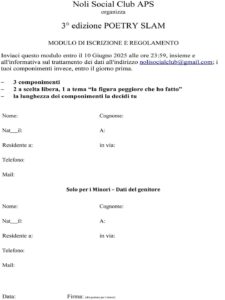 Modulo di iscrizione da compilare e da inviare entro il 10 giugno 2025  alle ore 23.59 insieme all’informativa sul trattamento dei dati all’indirizzo nolisocialclub@gmail.com, i componimenti entro un giorno prima.
