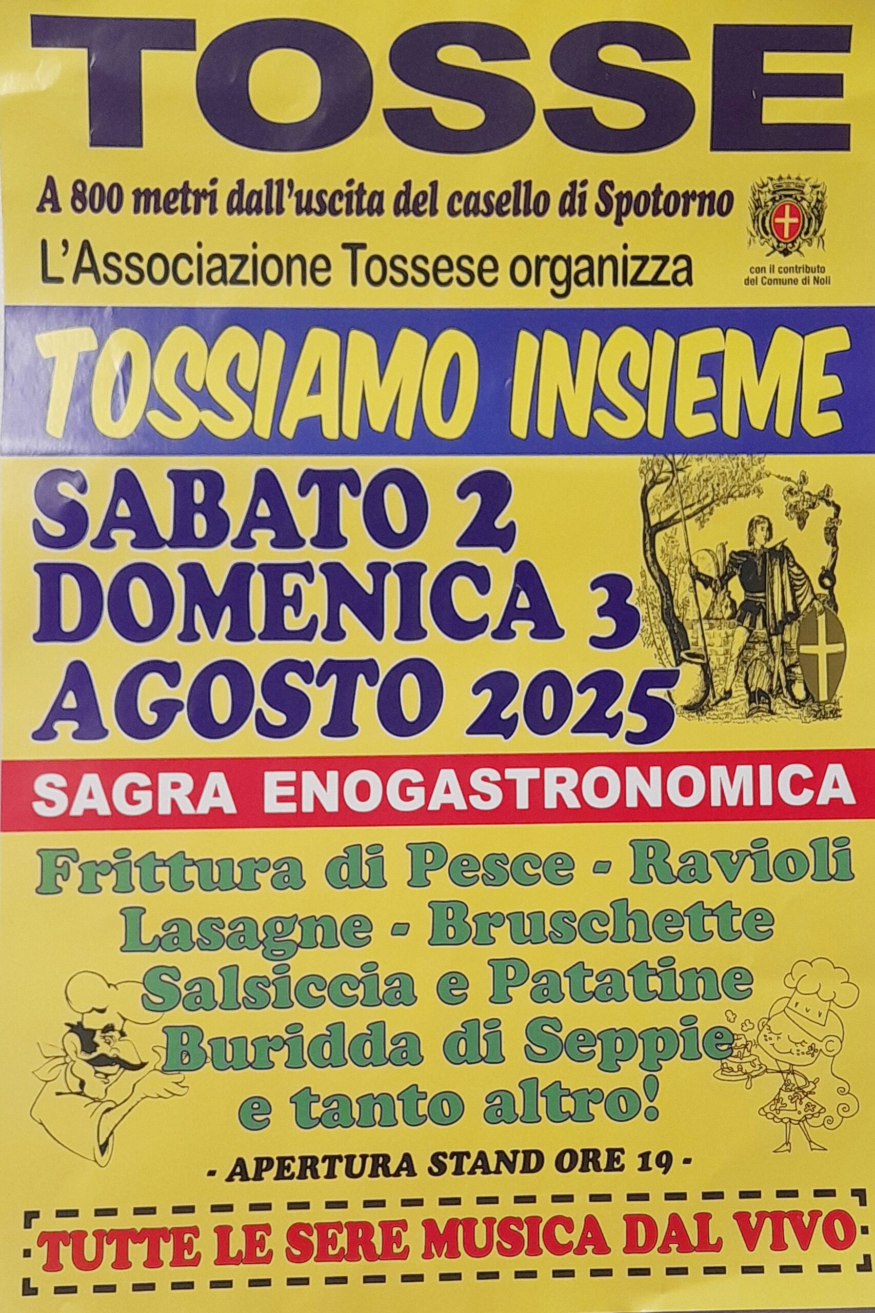 Sabato 2 agosto dalle ore 19.00, l’Associazione Tossese organizza “Tossiamo insieme” sagra enogastronomica con musica dal vivo.