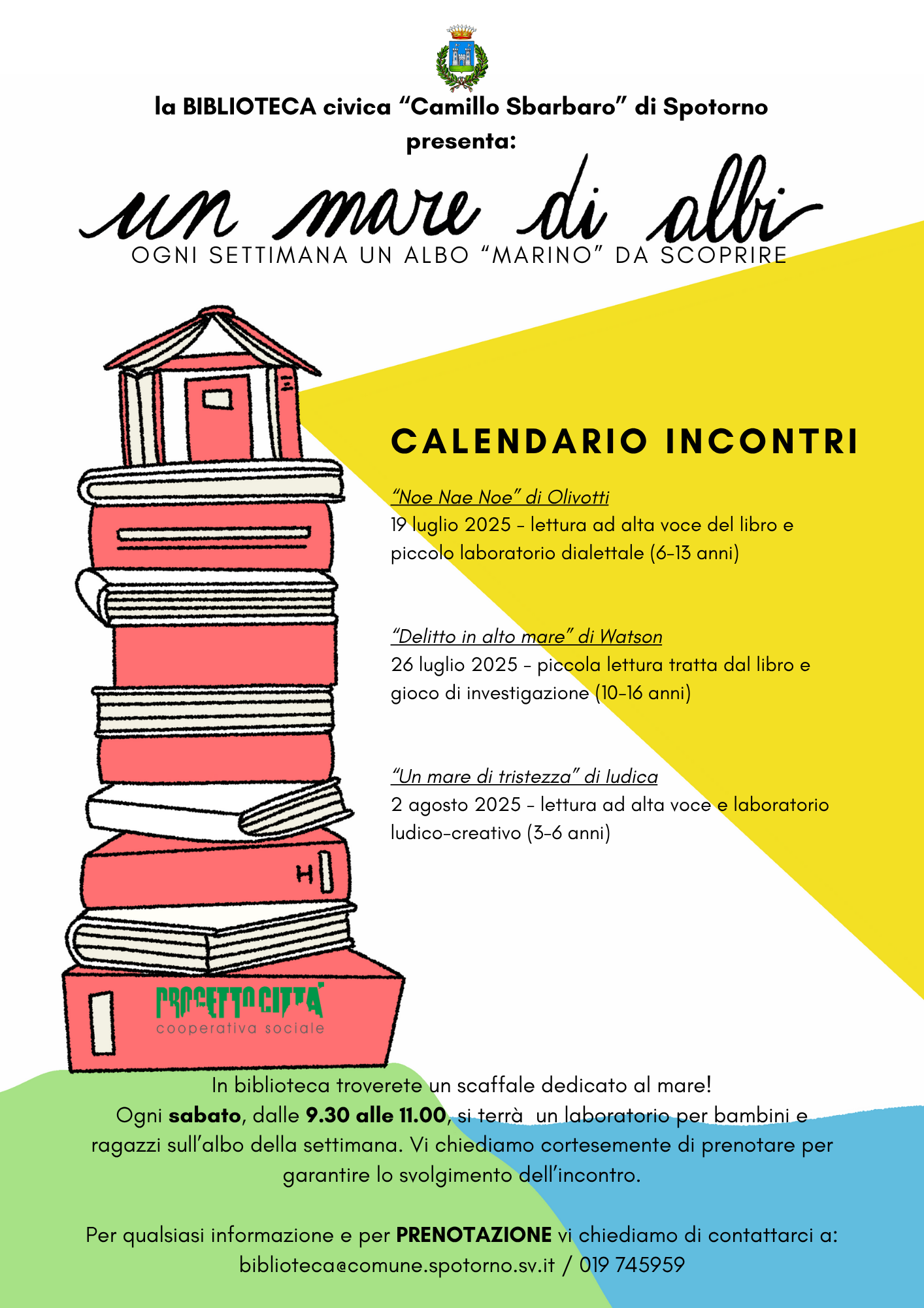 Presso la biblioteca civica Camillo Sbarbaro si terrà la lettura ad alta voce del libro ” un mare di tristezza” e laboratorio ludico-creativo per bambini dai 3 ai 6 anni. Prenotazione consigliata al numero 019/745959 o via mail biblioteca@comune.spotorno.sv.it