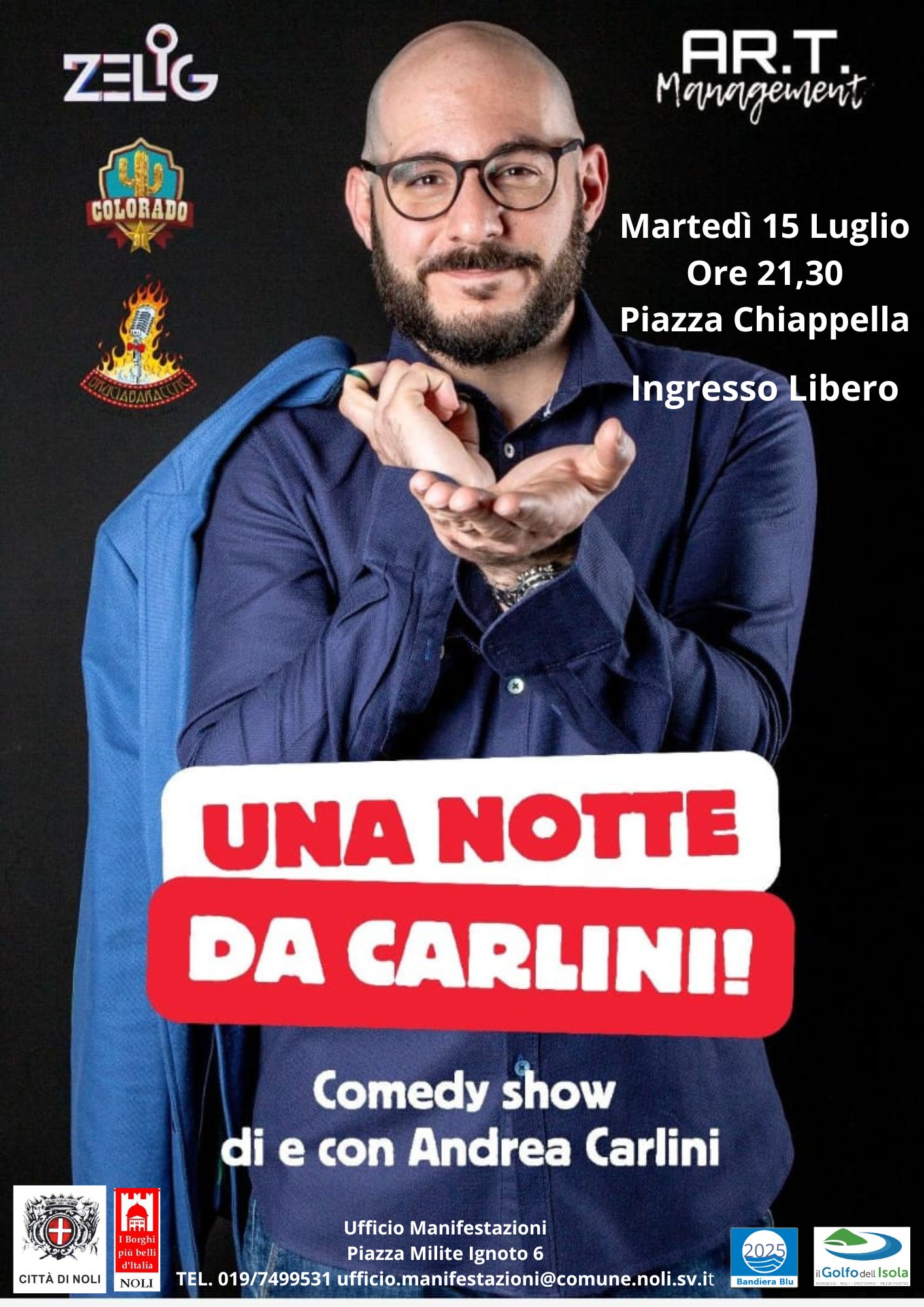 Martedì 15 luglio alle ore 21.30 in Piazza Chiappella a Noli “Una notte da carlini” Comedy Show di e con Andrea Carlini.