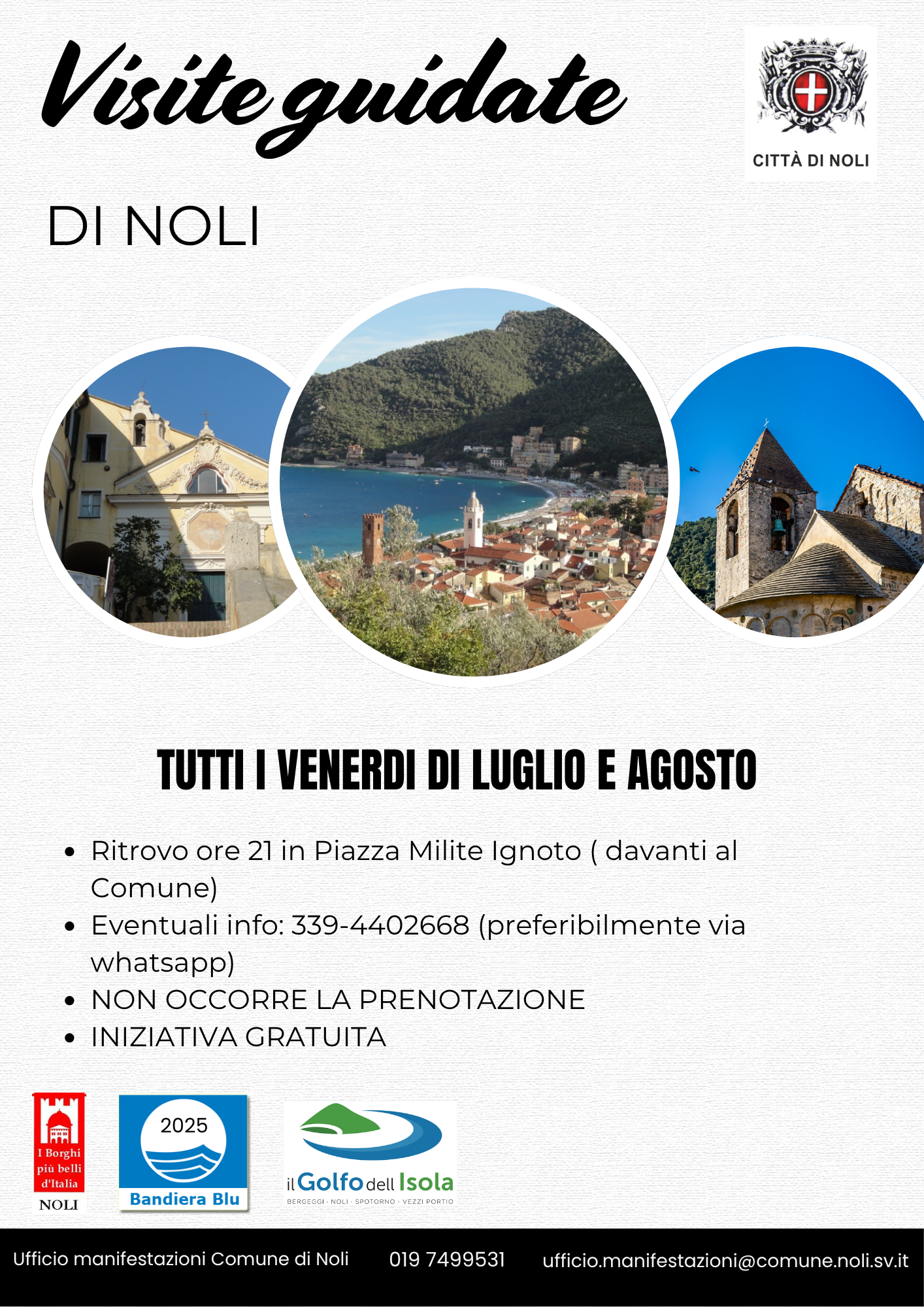 Venerdì 1 agosto ore 21.00 ritrovo in Piazza Milite Ignoto per VISITA GUIDATA dell’ antico borgo medievale di Noli. Non occorre prenotare ( informazioni al numero +39 3394402668).