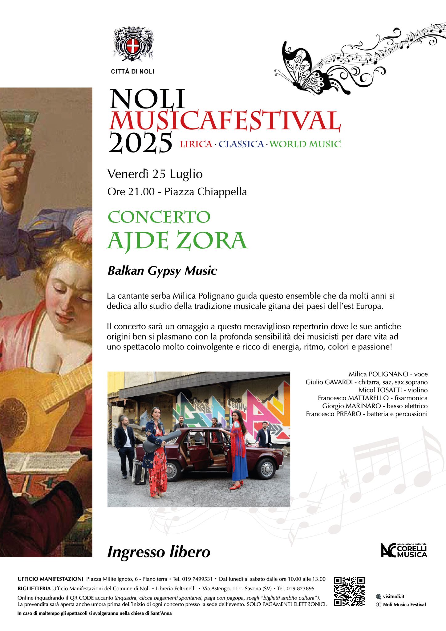 Venerdì 25 luglio ore 21.00 in Piazza Chiappella “Concerto Ajde Zora” – Balkan Gypsy Music. La cantante serba Milica Polignano guida questo ensemble che da molti anni si dedica allo studio della tradizione musicale gitana dei paesi dell’est Europa. Il concerto sarà un omaggio a questo meraviglioso repertorio dove le sue antiche origini ben si plasmano con la profonda sensibilità dei musicisti per dare vita ad uno spettacolo molto coinvolgente e ricco di energia, ritmo, colori e passione.