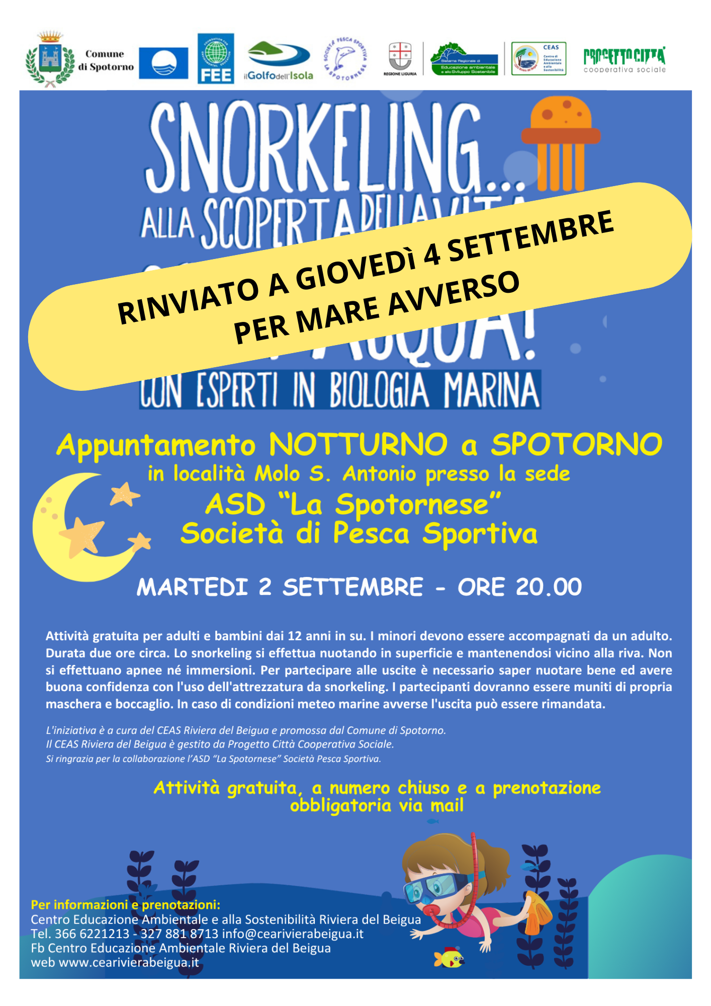 Appuntamento notturno a Spotorno con lo snorkeling del Centro Educazione Ambientale Riviera del Beigua con esperti in biologia marina. Giovedì 4 Settembre ore 20.00 in località Molo S. Antonio presso la sede ASD 'La Spotornese' Società di Pesca Sportiva. Attività gratuita a numero chiuso per adulti e bambini dai 12 anni in su,prenotazione obbligatoria al