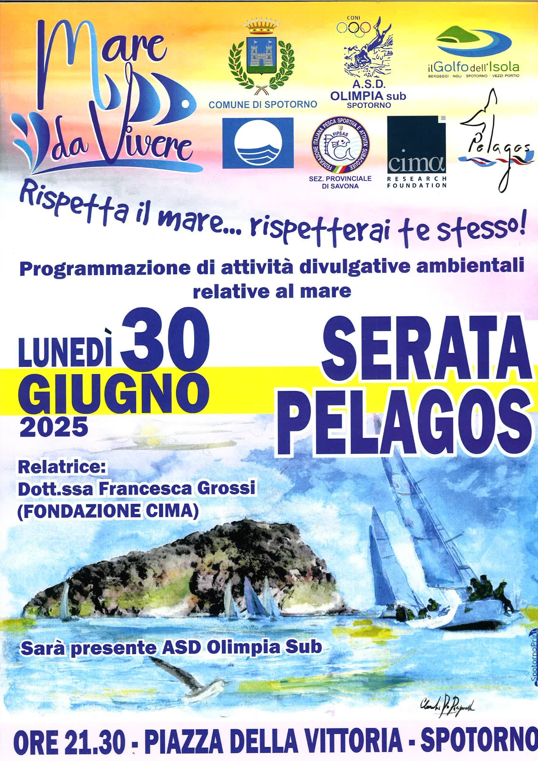 Lunedì 30 giugno 2025 ore 21.30 in Piazza della Vittoria "Serata Pelagos", programmazione di attività divulgative ambientali relative al mare. Relatrice Dott.ssa Francesca Grossi della Fondazione Cima, sarà presente ASD Olimpia Sub. Ingresso libero.