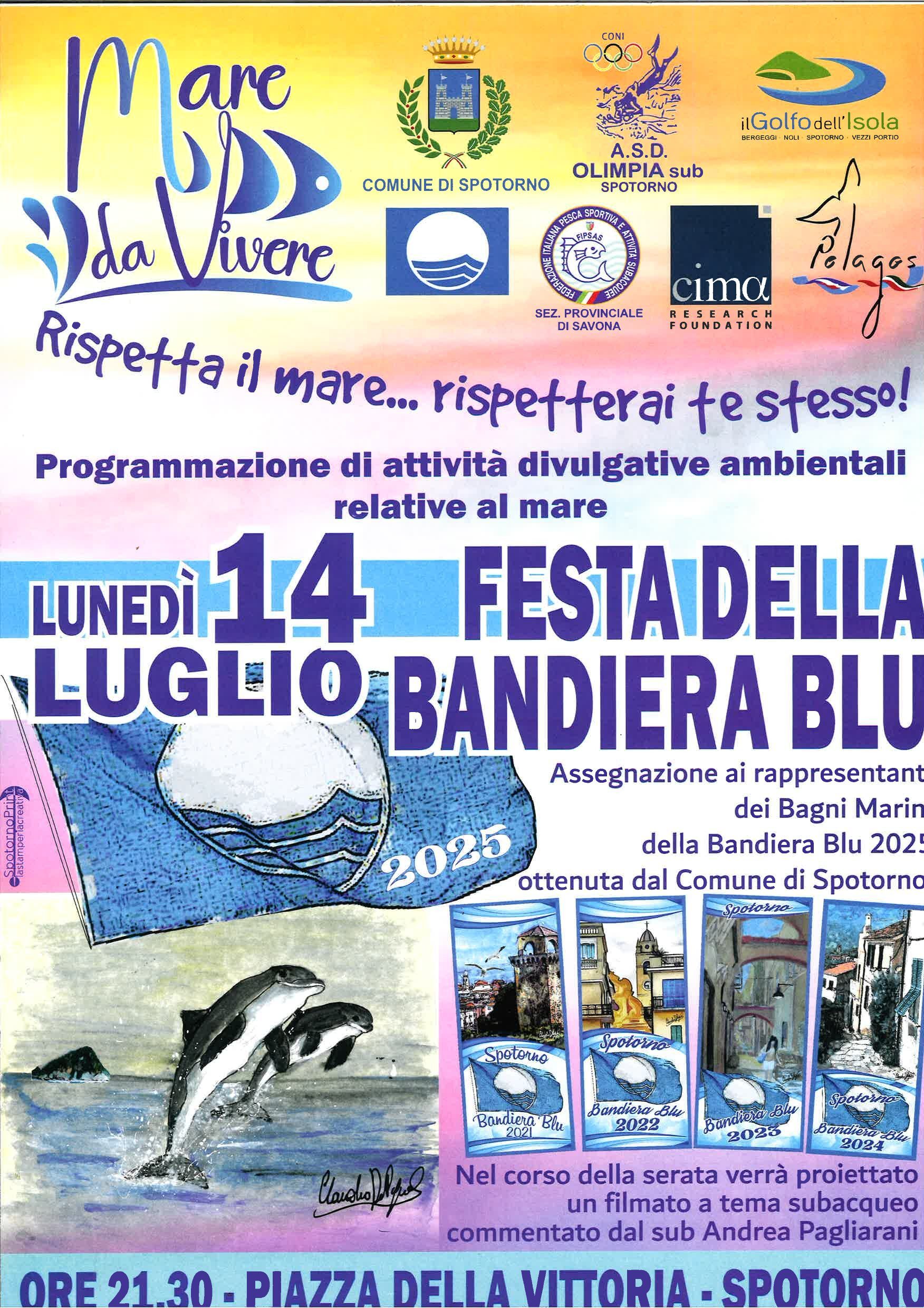Lunedì 14 luglio ore 21.30 in Piazza della Vittoria, assegnazione ai rappresentanti dei Bagni Marini della Bandiera Blu 2025 ottenuta dal Comune di Spotorno. Nel corso della serata verrà proiettato un filmato a tema subacqueo commentato dal sub Andrea Pagliarani. Ingresso libero.