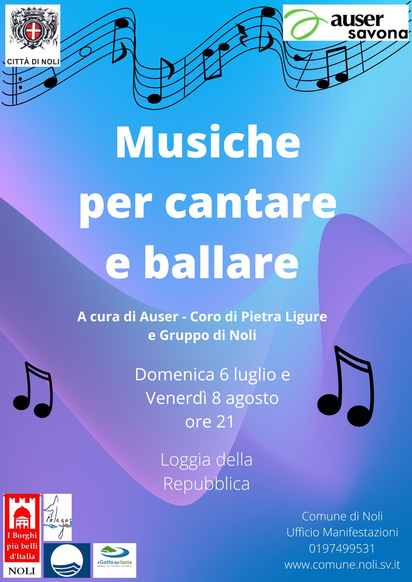 Domenica 6 luglio la sezione Auser di Noli, in collaborazione con la Città di Noli ed il Coro di Pietra Ligure organizza una serata musicale per cantare e ballare insieme sotto la Loggia della Repubblica Nolese. Ingresso libero.