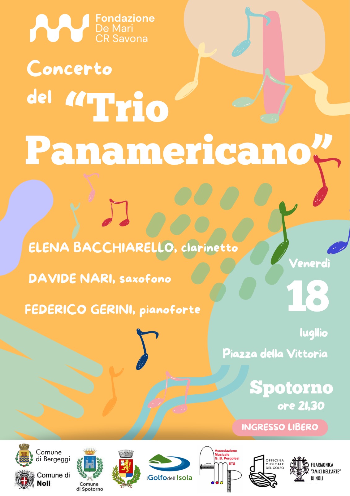Venerdì 18 luglio alle ore 21.30 in Piazza della Vittoria concerto del "Trio Panamericano" con: Elena Bacchiarello al clarinetto, Davide Nari al saxofono, Federico Gerini al pianoforte. Ingresso libero