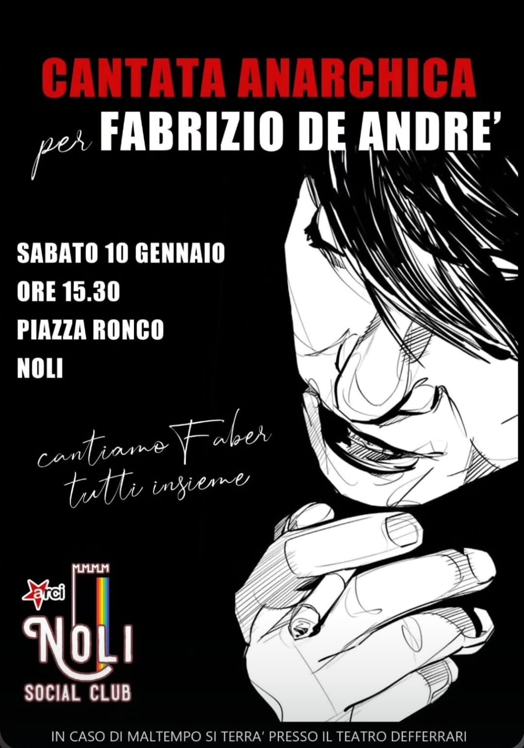 Il Noli Social Club organizza una 'Cantata anarchica per Fabrizio DeAndrè' sabato 10 Gennaio alle ore 15.30 in P.zza Ronco a Noli In caso di maltempo l'evento avrà luogo presso