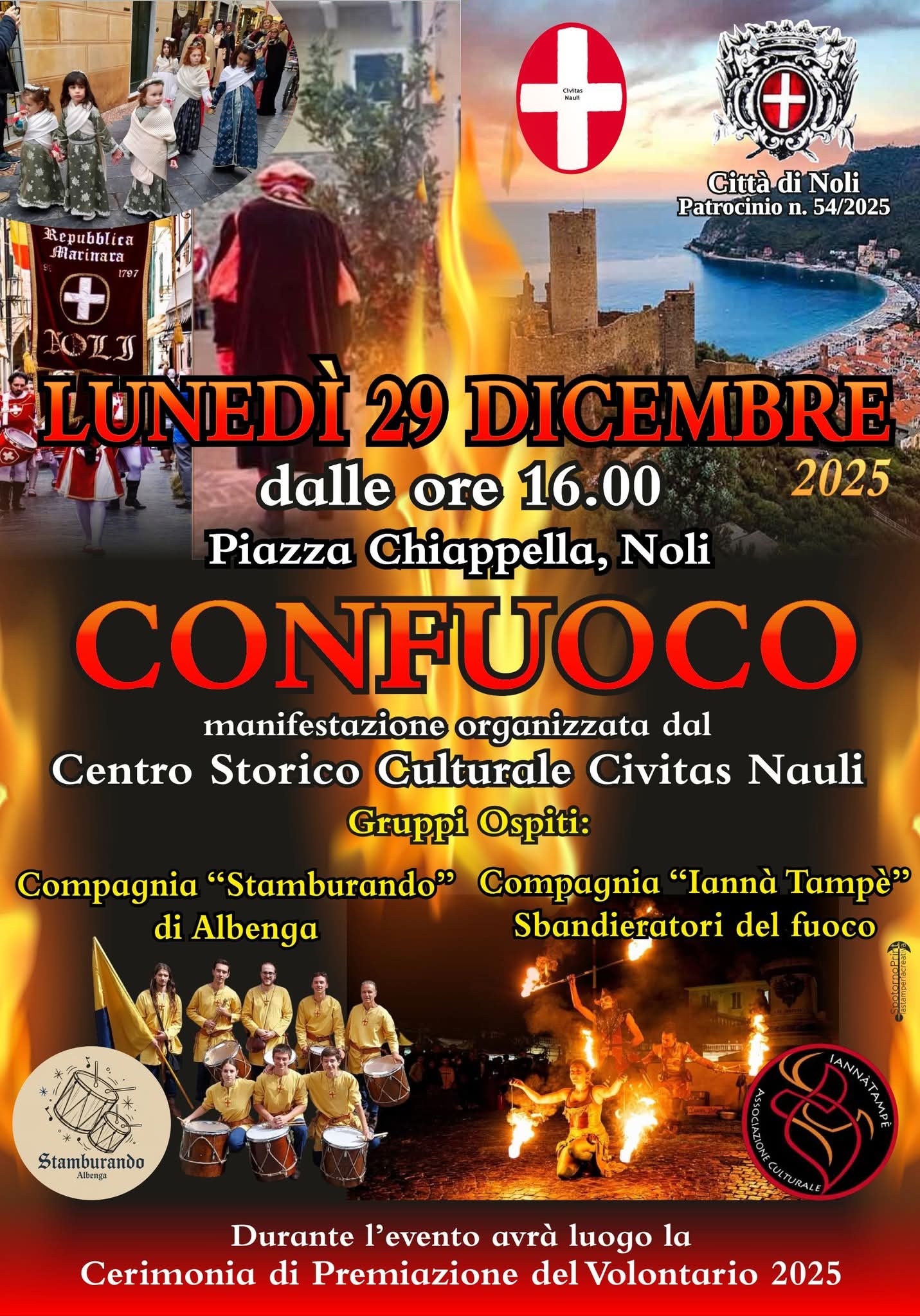 Lunedì 29 dicembre 2025, alle ore 16.00, in Piazza Chiappella a Noli, si terrà il tradizionale Confuoco, manifestazione organizzata dal Centro Storico Culturale Civitas Nauli. All’evento parteciperanno la Compagnia “Stamburando”