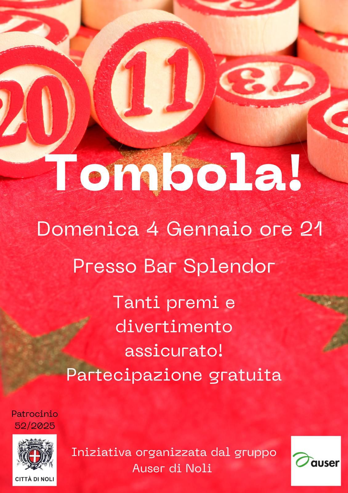 L'AUSER di Noli con il patrocinio della Città di Noli organizza domenica 4 Gennaio 2026 la tombola presso il Bar Splendor a partire dalle ore 21.00 Premi e divertimento assicurati.