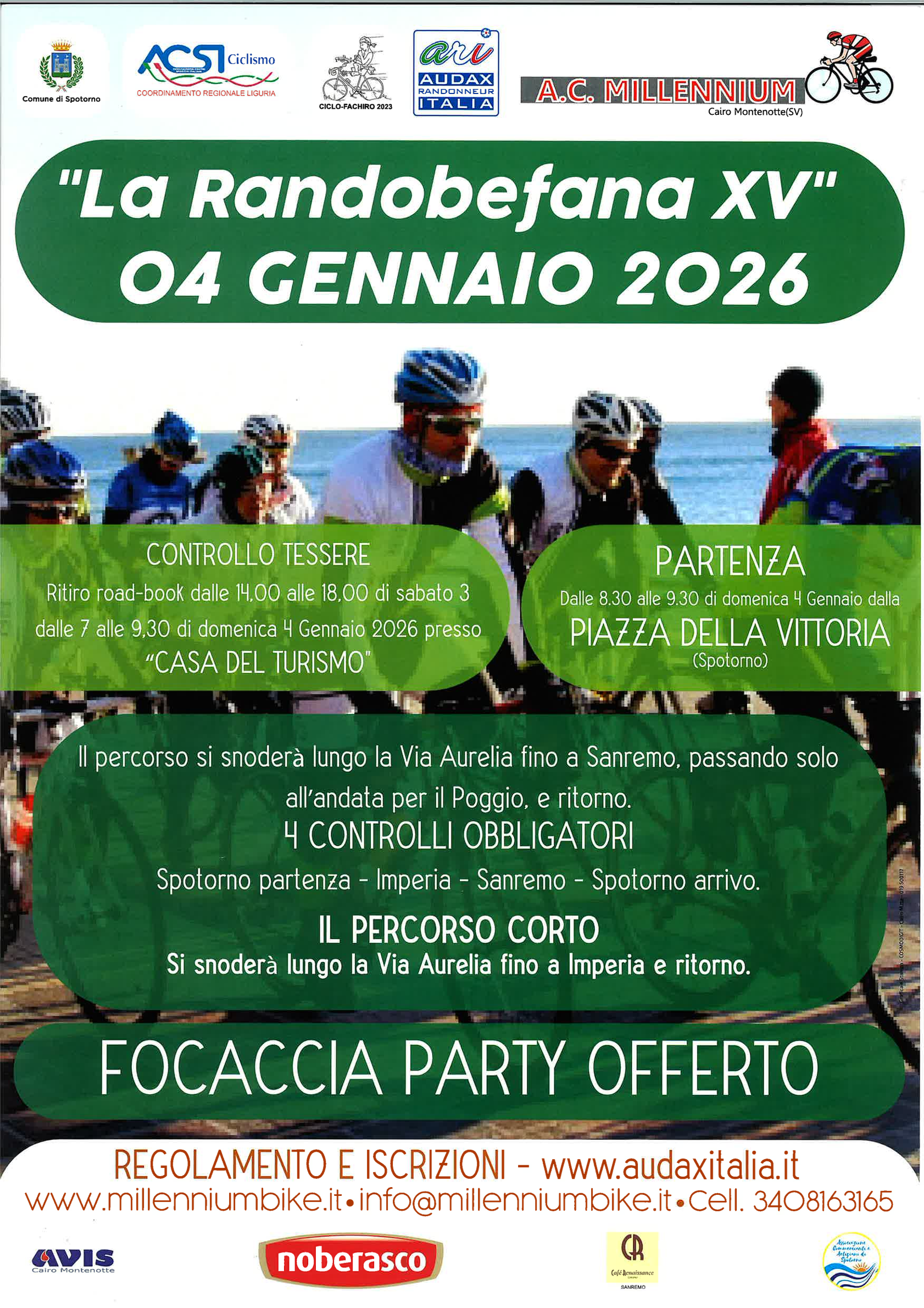 Domenica 4 gennaio 2026  si terrà "La Randobefana XV" Il percorso si snoderà lungo la Via Aurelia fino a Sanremo, passando all'andata per il Poggio e ritorno. Il percorso corto