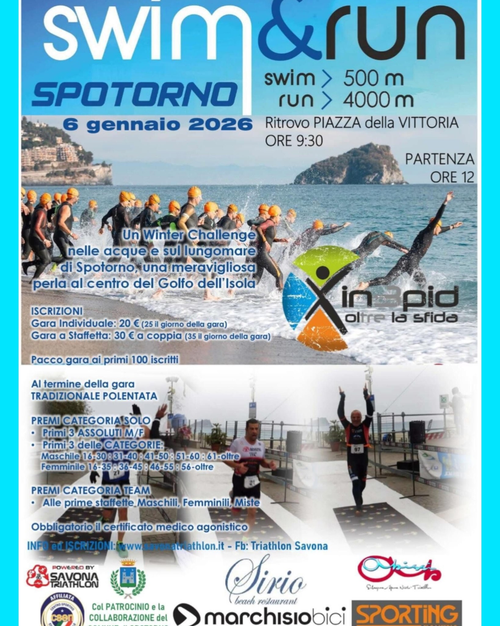Martedì 6 gennaio 2026 torna la Swim & Run: una winter Challenge nelle acque e sul lungomare di Spotorno, una meravigliosa perla del Golfo dell'Isola. Ritrovo alle ore 9:30 in