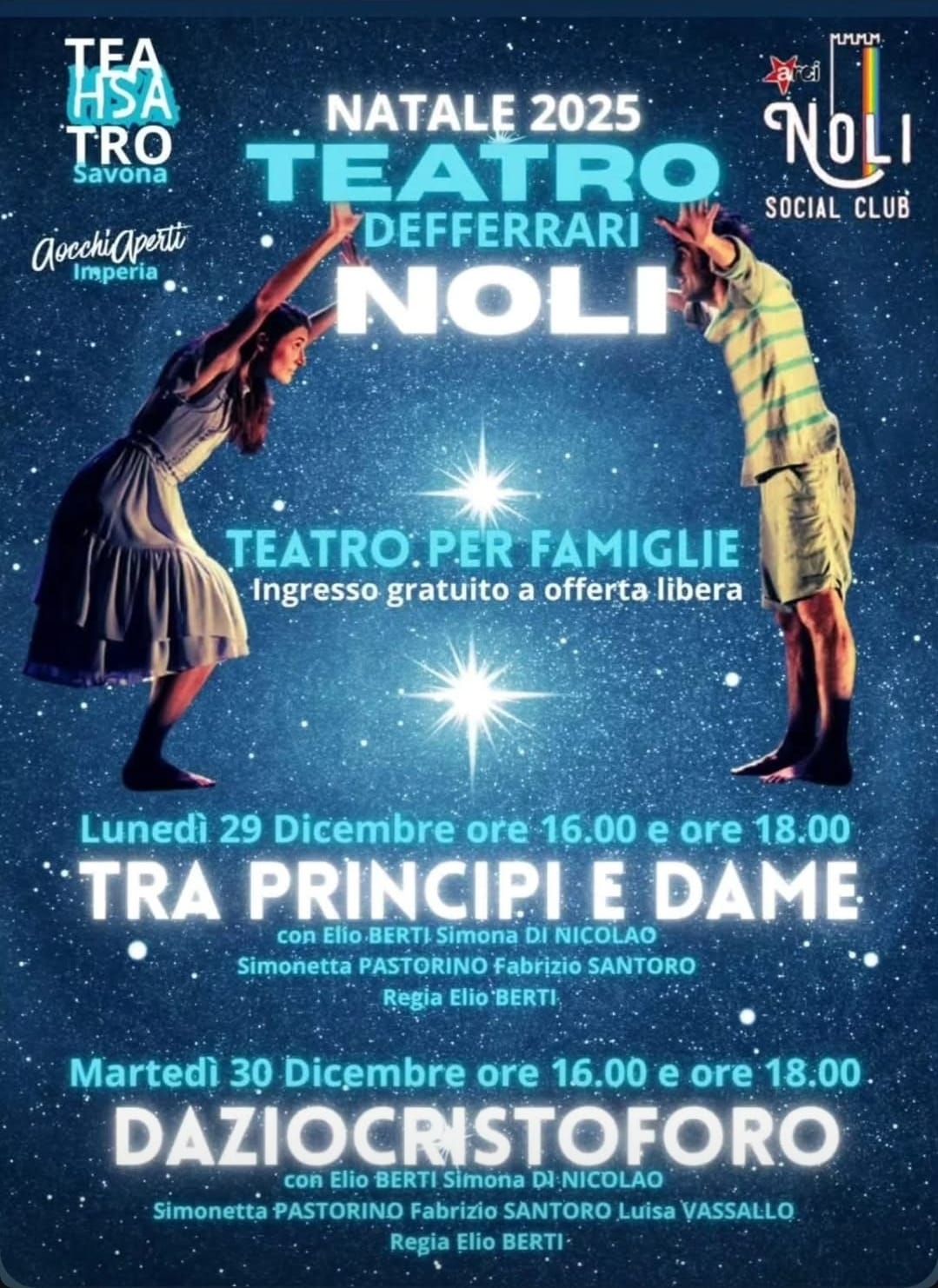 Il Teatro Defferrari di Noli con Noli Social Club vi invitano a due spettacoli teatrali per famiglie con ingresso gratuito ad offerta libera per le seguenti date: Lunedì 29 Dicembre
