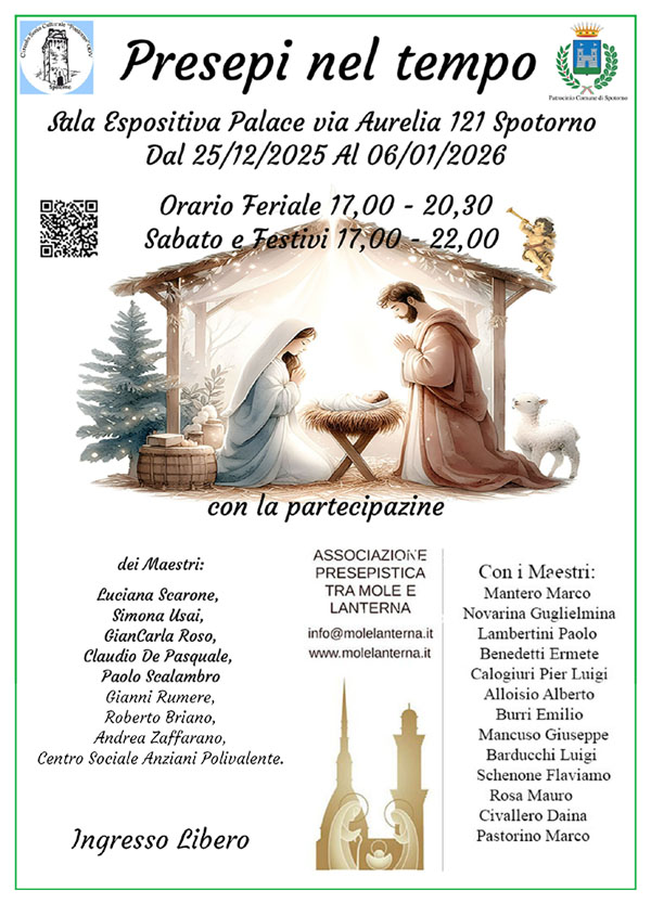 Il Circolo Socio Culturale Pontorno e il Comune di Spotorno vi invitano alla mostra 'Presepi nel tempo' Da giovedì 25 Dicembre a martedì 6 Gennaio 2026 presso la Sala espositiva