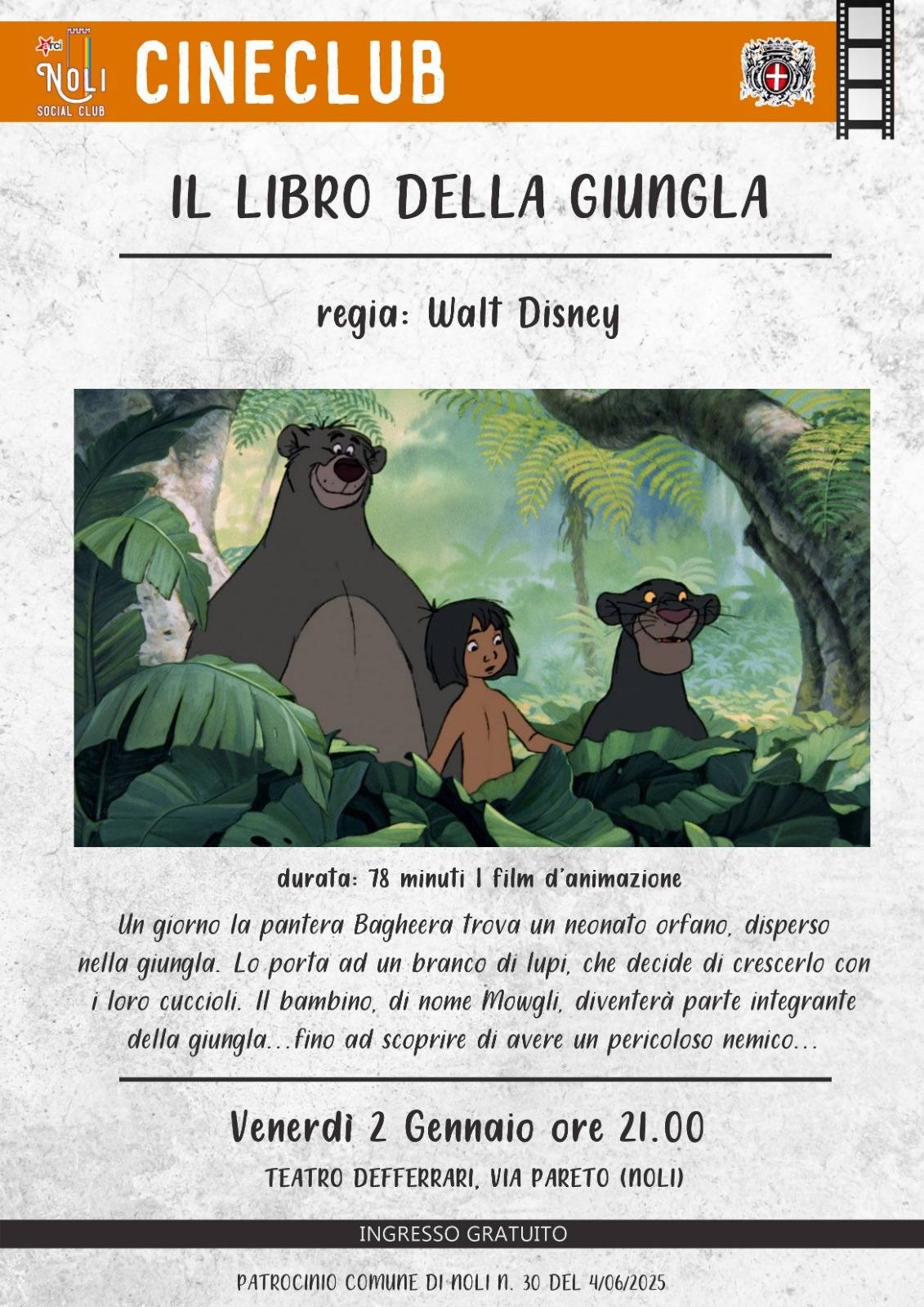 Il Cineclub di Noli propone la proiezione de “Il Libro della Giungla”, celebre film d’animazione della Walt Disney. La proiezione si terrà venerdì 2 gennaio alle ore 21.00 presso il