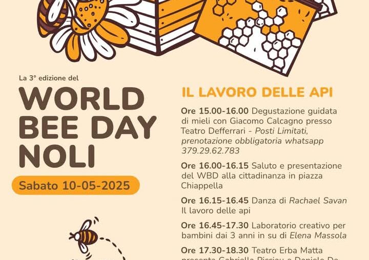 Sabato 10 maggio dalle ore 15.00 La Pro Loco di Noli aderisce al WORLD BEEDAY con il seguente programma: Ore…