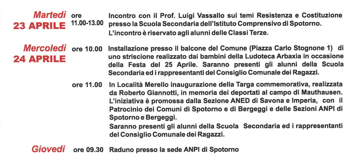 ore 9.30 Raduno presso sede Anpi Spotorno ore 10 Corteo per le vie cittadine con la Banda Musicale di Cogoleto…