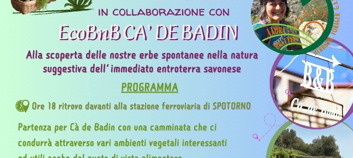 Sabato 19 luglio dalle ore 18.00 alle ore 21.00 a Cà de Badin (frazione Tosse-Noli), passeggiata botanica e corso di…