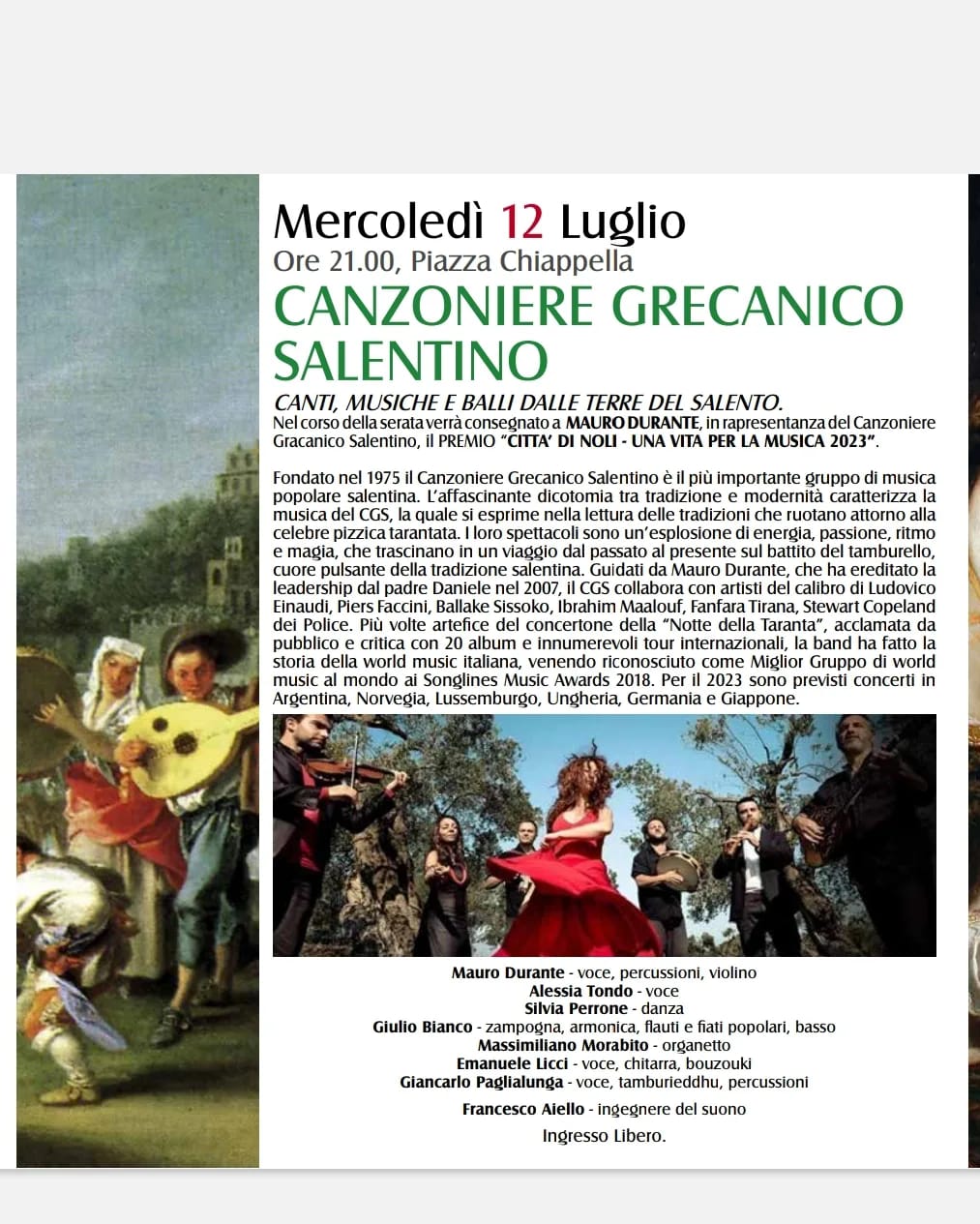 Nel corso della serata verrà consegnato a Mauro Durante, in rappresentanza del Canzoniere Grecanico Salentino, il PREMIO CITTA’ DI NOLI – UNA VITA PER LA MUSICA 2023