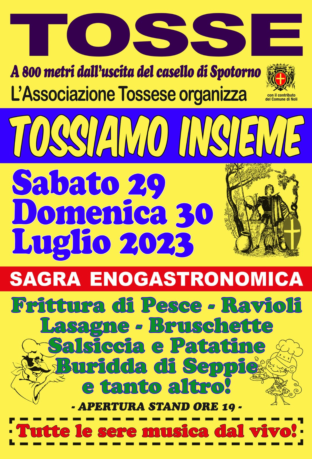 “Tossiamo Insieme” Sagra Enogastronomica con frittura di pesce, Ravioli, Lasagne, Bruschette, Salsiccia e Patatine, Buridda di Seppie e tanto altro!!Tutte le sere musica dal vivo.