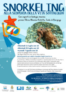 L’Area Marina Protetta Isola di Bergeggi, col contributo di Fondazione Compagnia di San Paolo, propone un’escursione guidata di snorkeling gratuita con esperti in biologia marina a cura del  Centro Educazione Ambientale Riviera del Beigua.
