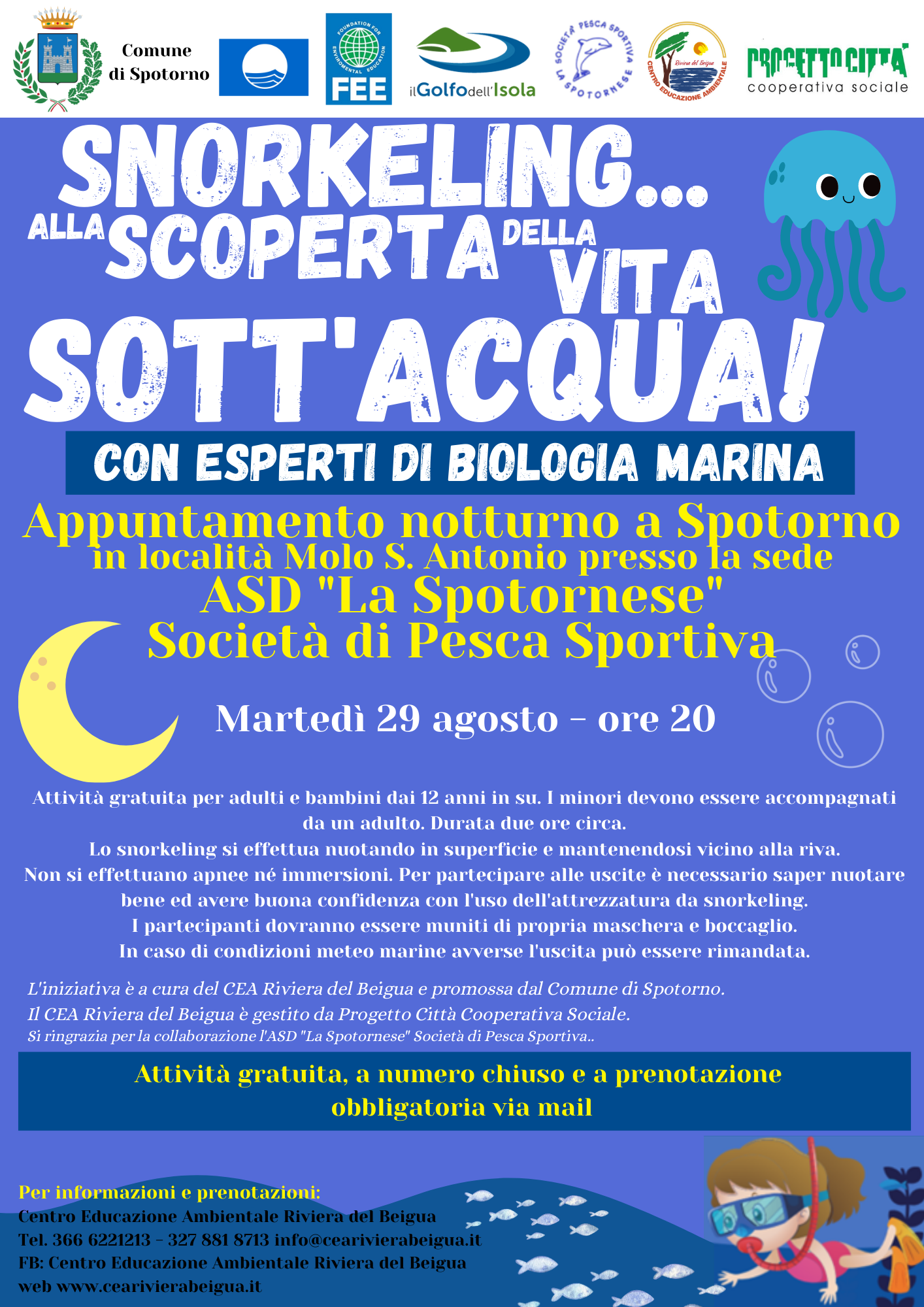 Snorkeling notturno per adulti e bambini dai 12 anni in su, con esperti di biologia marina del Centro Educazione Ambientale Riviera del Beigua.