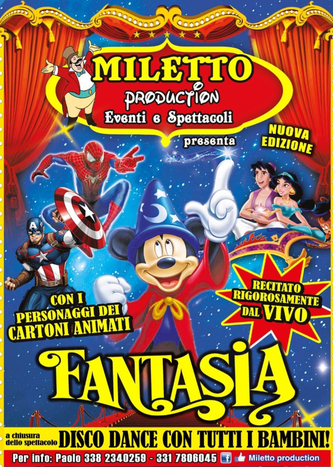 La Miletto production propone una serata di animazione con i beniamini dei cartoni animati dal vivo e a chiusura spettacolo disco dance con tutti i bambini.